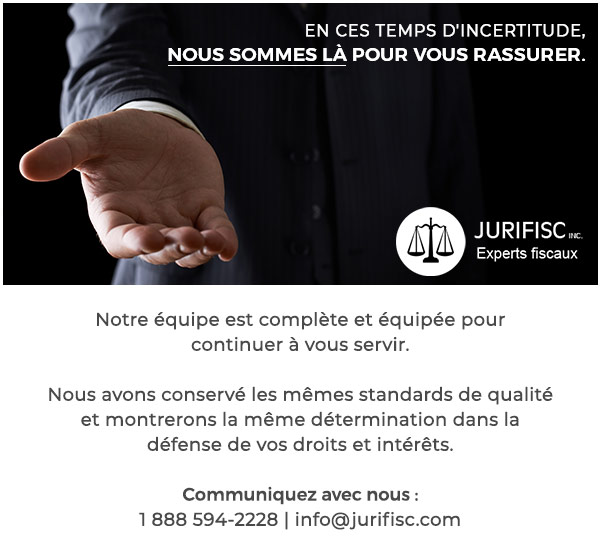 | Jurifisc est une firme spécialisée dans le règlement des problèmes fiscaux quels qu'ils soient. Nos experts bénéficient de solides formations et d'expérience dans de multiples domaines (droit, comptabilité, finance, affaires, gouvernements). Notre objectif est de résoudre vos problèmes fiscaux de façon hautement professionnelle et efficace, à un coût abordable.